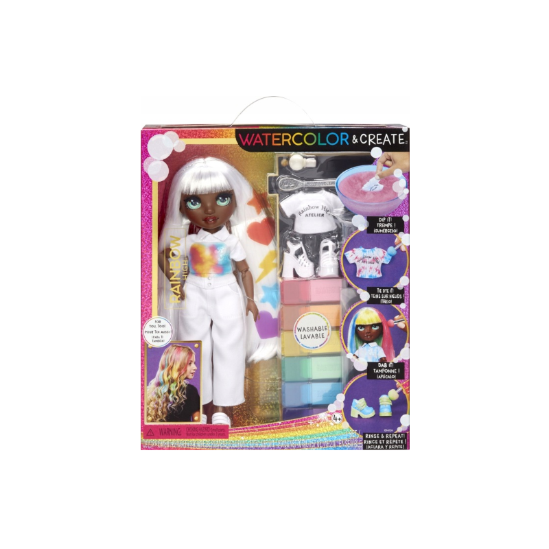 Lalka MGA Rainbow High WaterColor and Create przeznaczona jest dla dzieci, które lubią tworzyć i eksperymentować. Ta lalka jest idealna dla dzieci w wieku 4 lat i starszych, które chcą wypróbować różne techniki kreatywne i stworzyć swój własny, niepowtarzalny projekt.