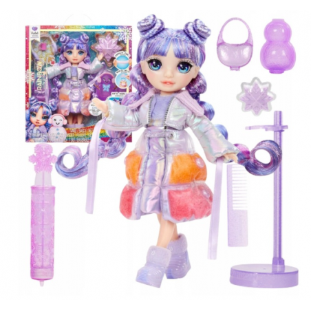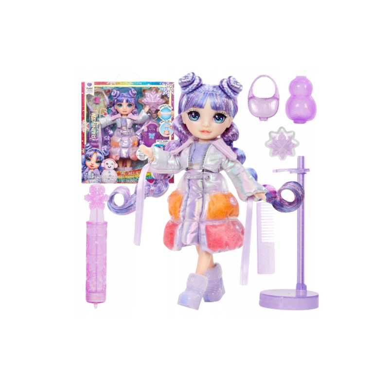 Lalka ubrana jest w ciepłą kurtkę z magicznym śniegiem, dzięki której strój nabiera wyjątkowego, zimowego charakteru. Wystarczy odrobina wody, aby kurtka Violet powiększyła się, stając się puszysta i ujawniając nowe, intensywne odcienie – to prawdziwa modowa magia, która zachwyci każdego fana Rainbow High!